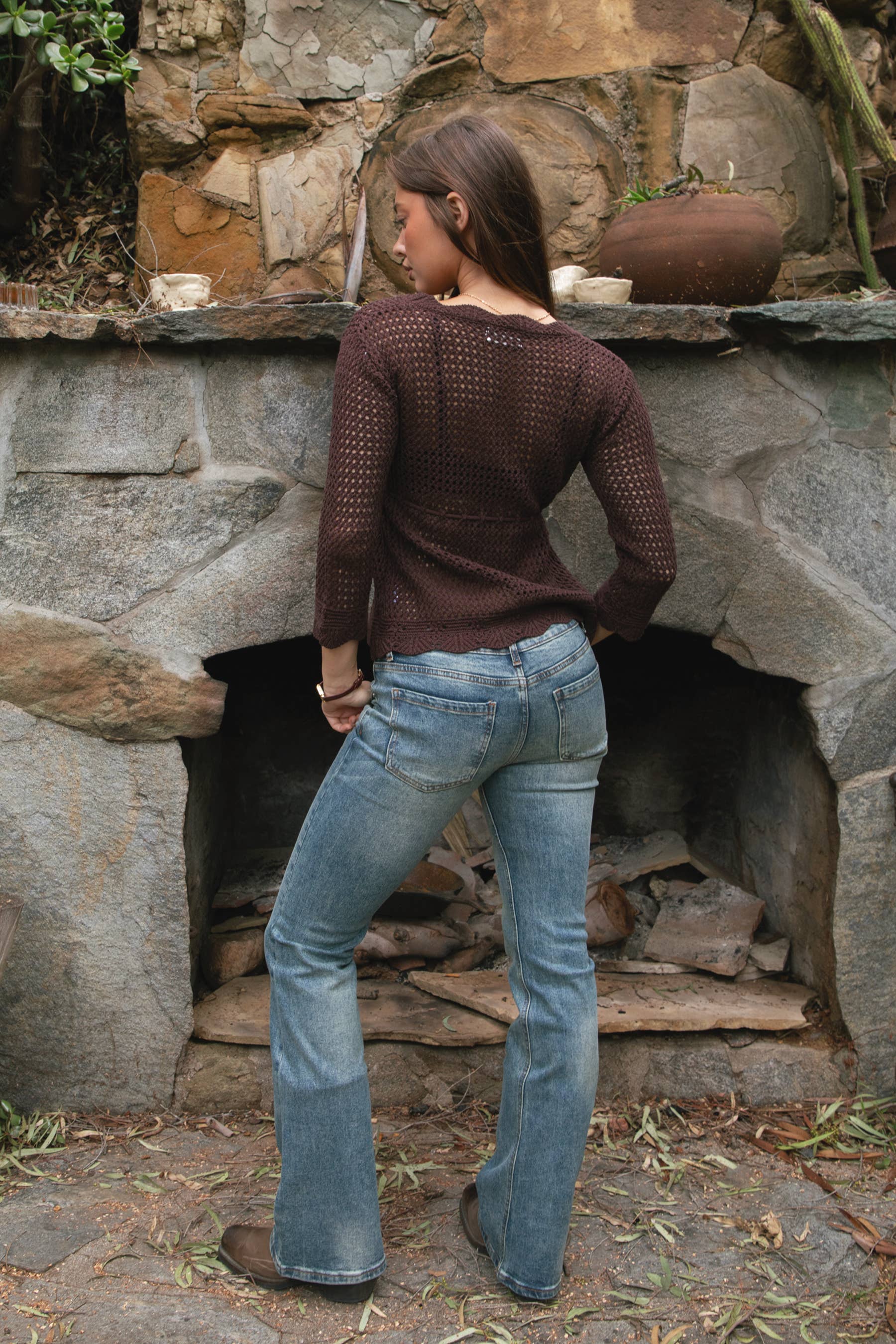 The Ashlyn crochet cardigan has a scalloped v-neckline with adjustable front ties for closure and style. It also has a peplum-inspired feminine shape to highlight the curves. This cardigan is perfect for layering and creating a boho or western style!