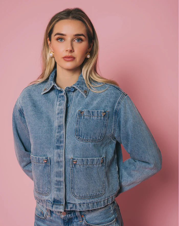 Our Magali Jacket returns in the perfect blue denim, updated with chrome heart hardware placed at the corners of the front pockets. This version features a self-fabric collar (no contrast here), a quilted lining for warmth, and a hidden front placket so the buttons stay clean and understated.
