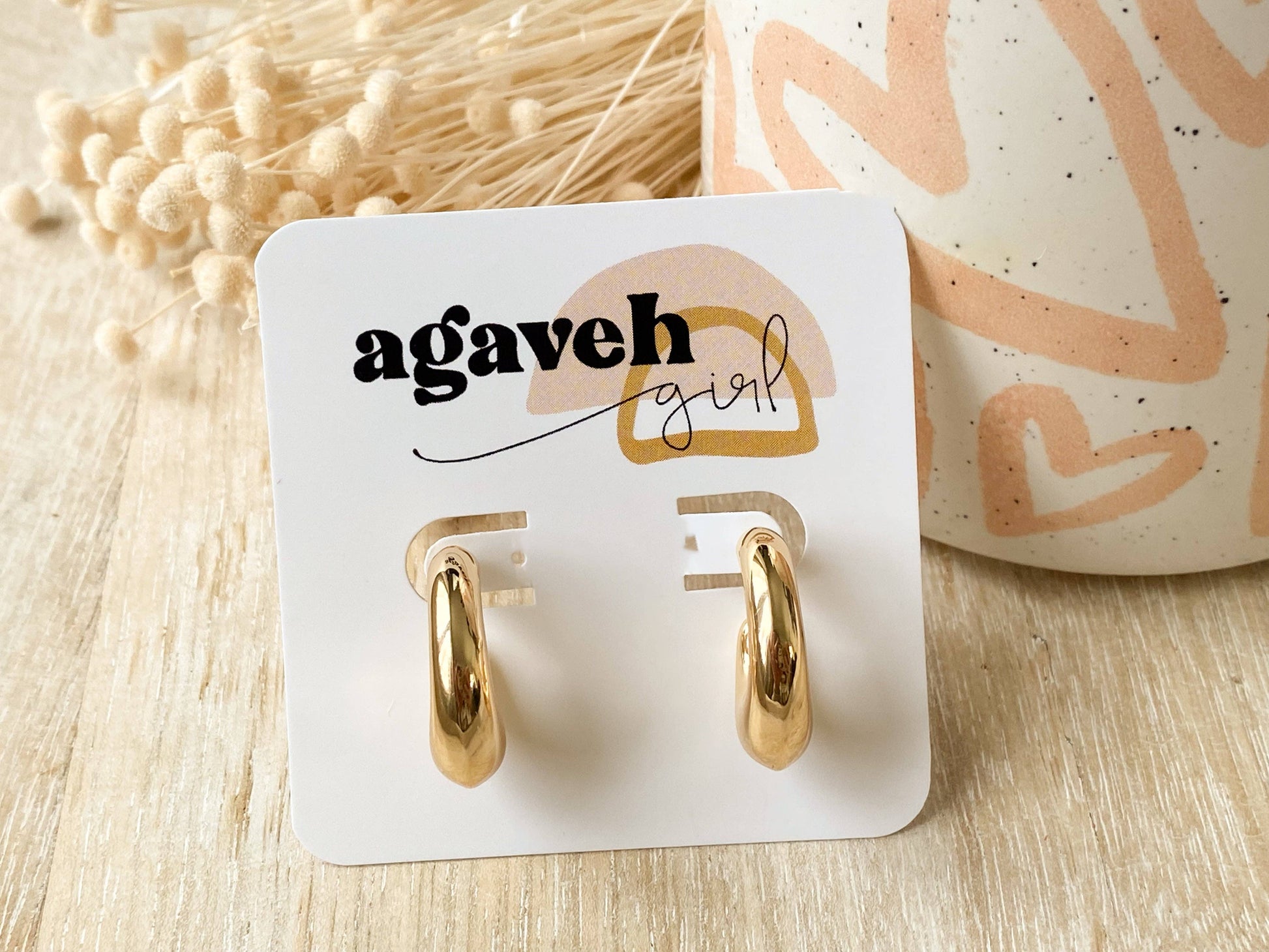 These C-shaped chunky hoop earrings measure approximately 23mm by 16mm. Crafted from high-quality materials, they are 18k gold-plated, nickel-free, and tarnish-resistant.