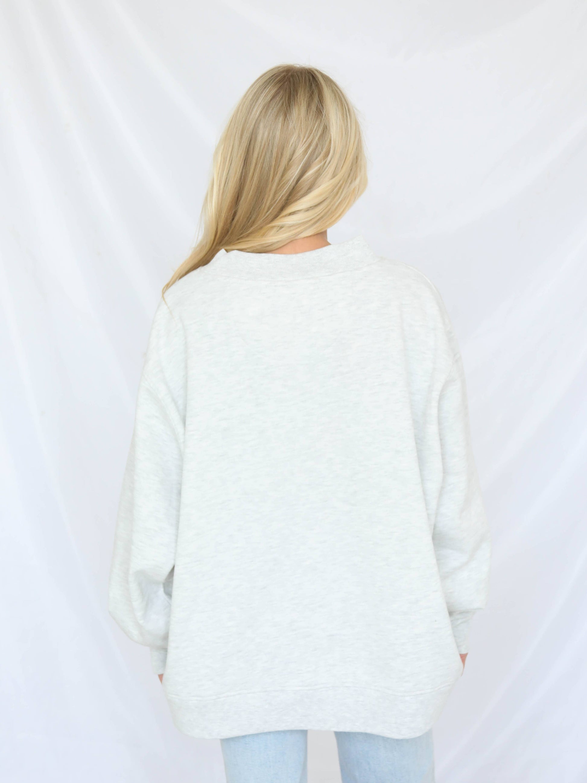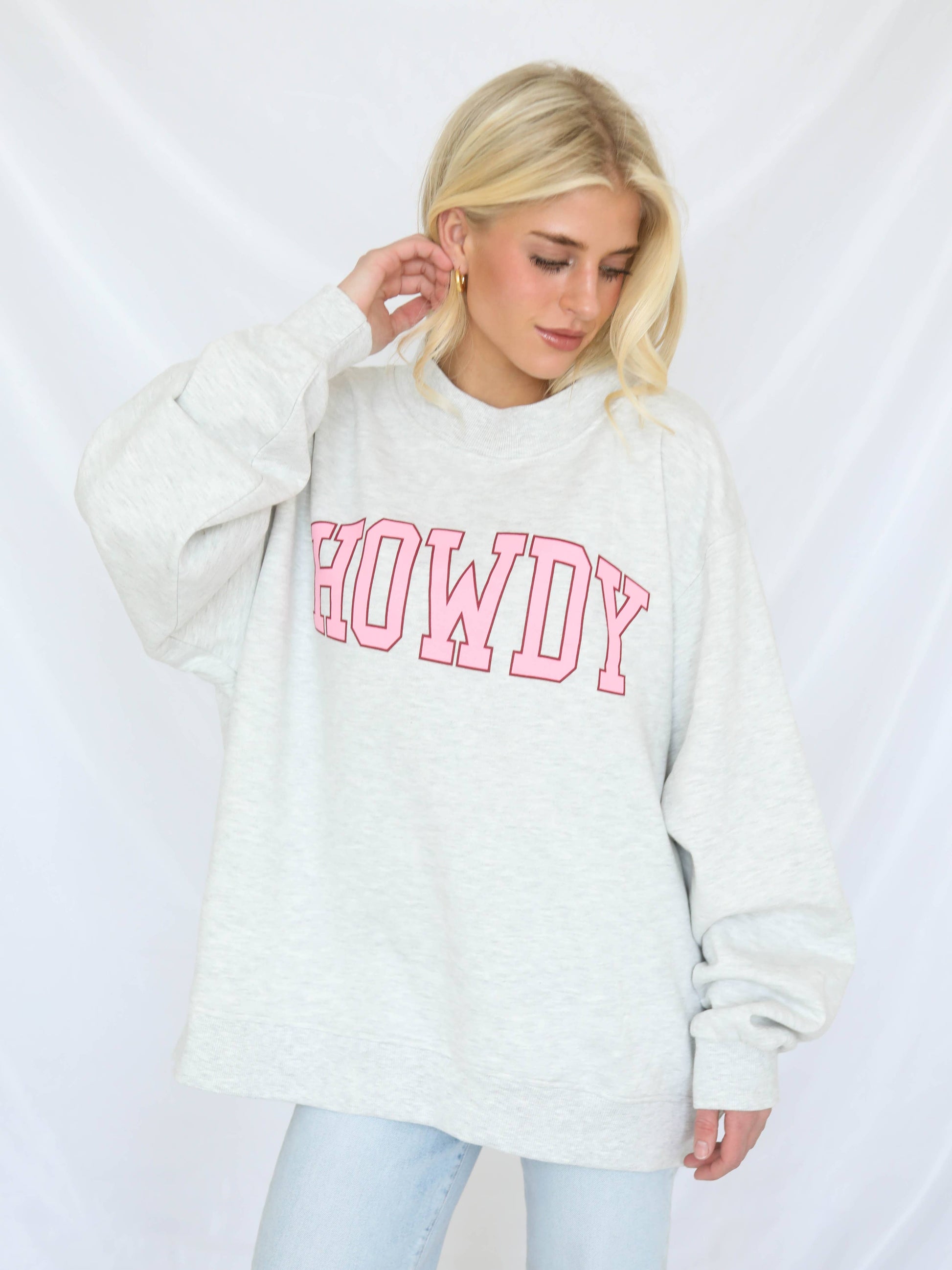 A playful mock neck sweatshirt with a pink HOWDY varsity graphic. Crafted in a cozy cotton blend with a relaxed fit and wide trim.