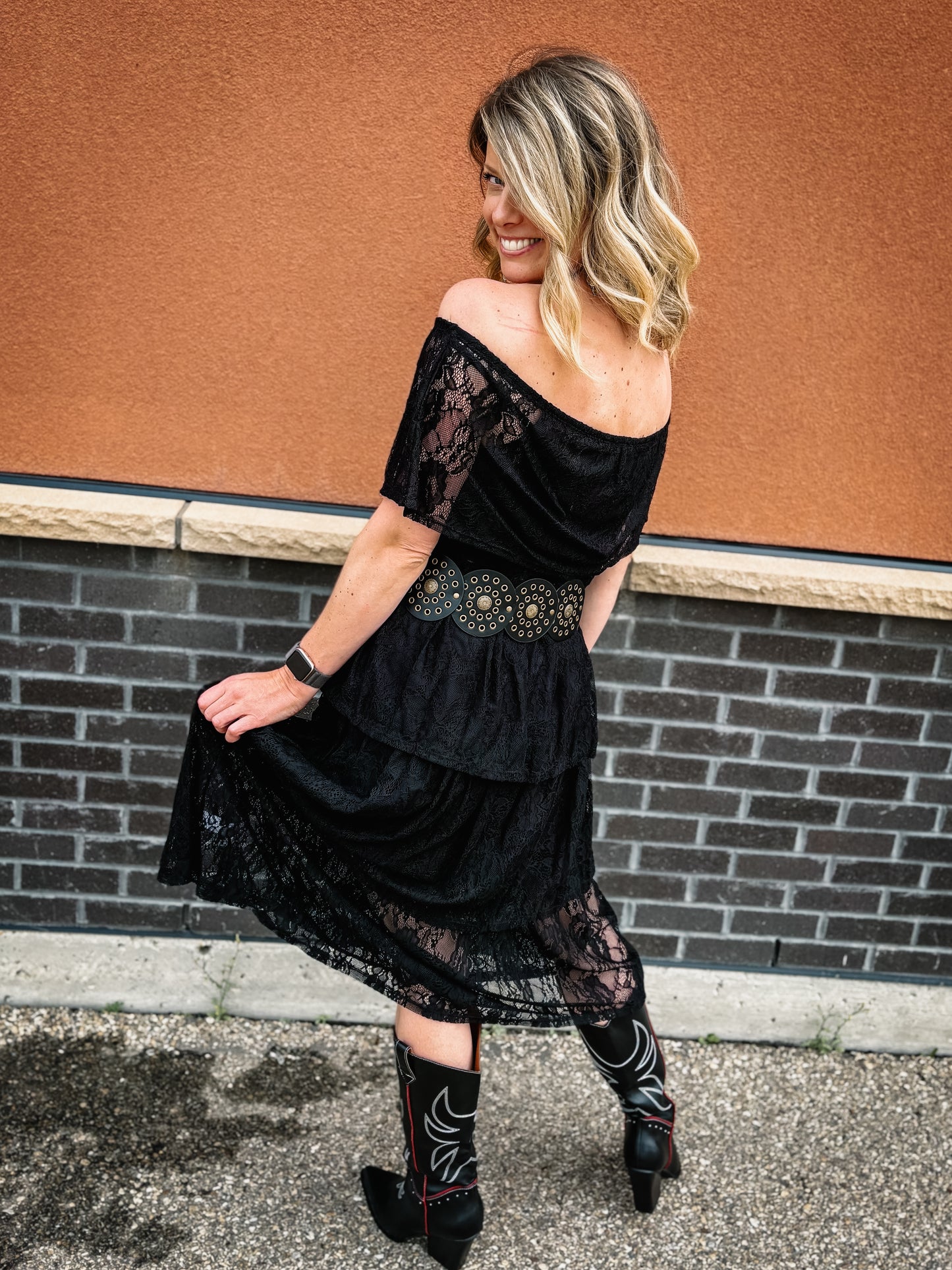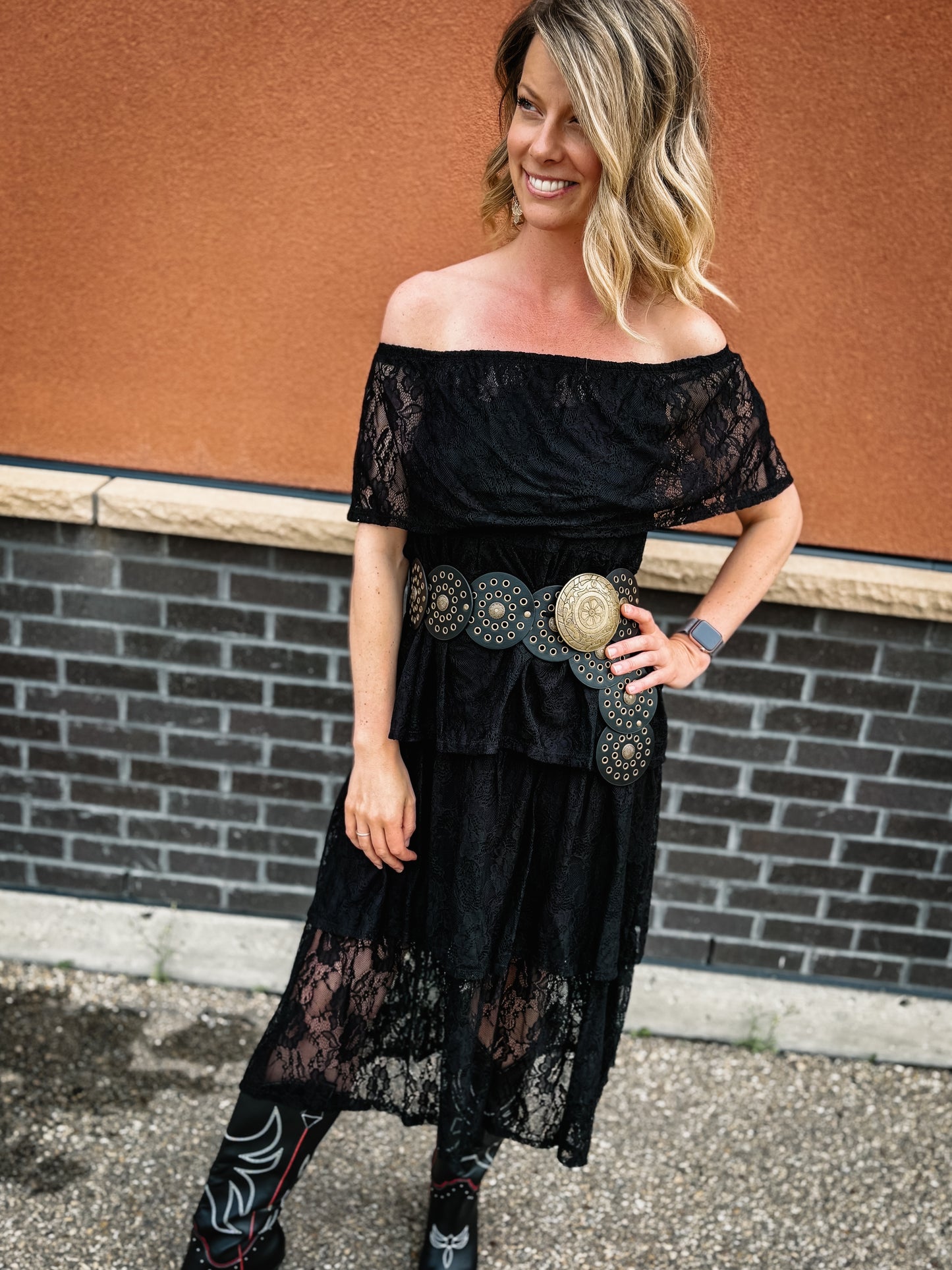 • Turn heads in this playful lace off-the-shoulder dress with a layered midi skirt. Jack wears a size S—get ready to strut your inner cowgirl queen in this stunning look. Accessorized with the Western studded disc belt