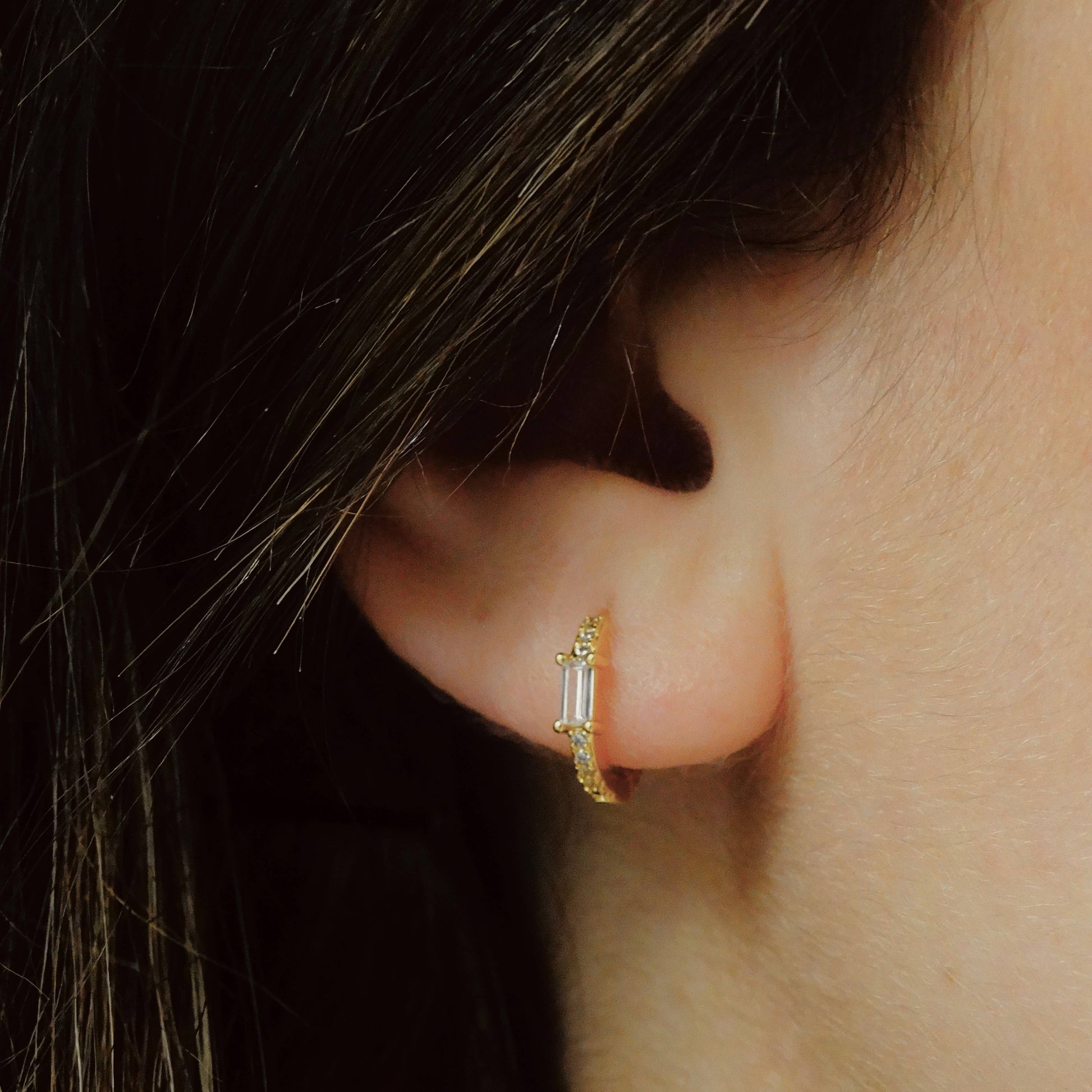 Stone encrusted Huggies with a rectangular glass stone in the middle.