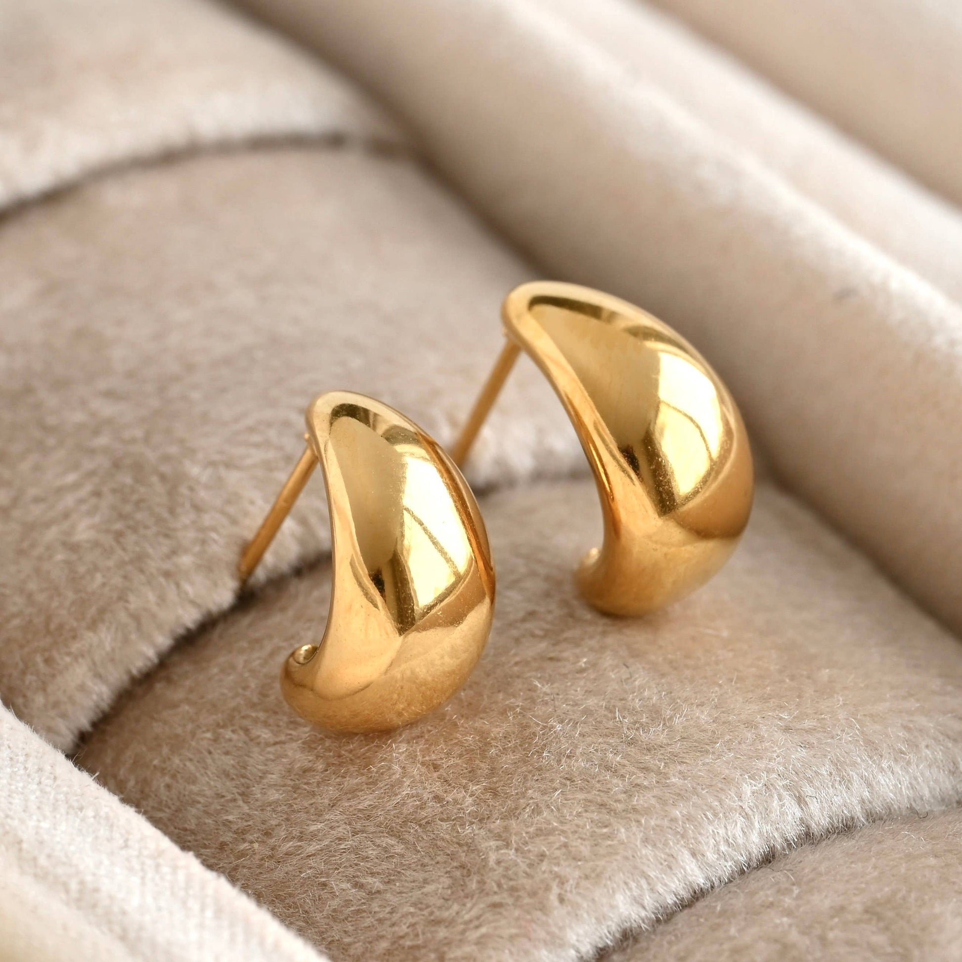 These sleek dome huggie earrings offer a modern, minimalist touch. Made from stainless steel and PVD plated with 18k gold, they’re waterproof and perfect for everyday wear.
