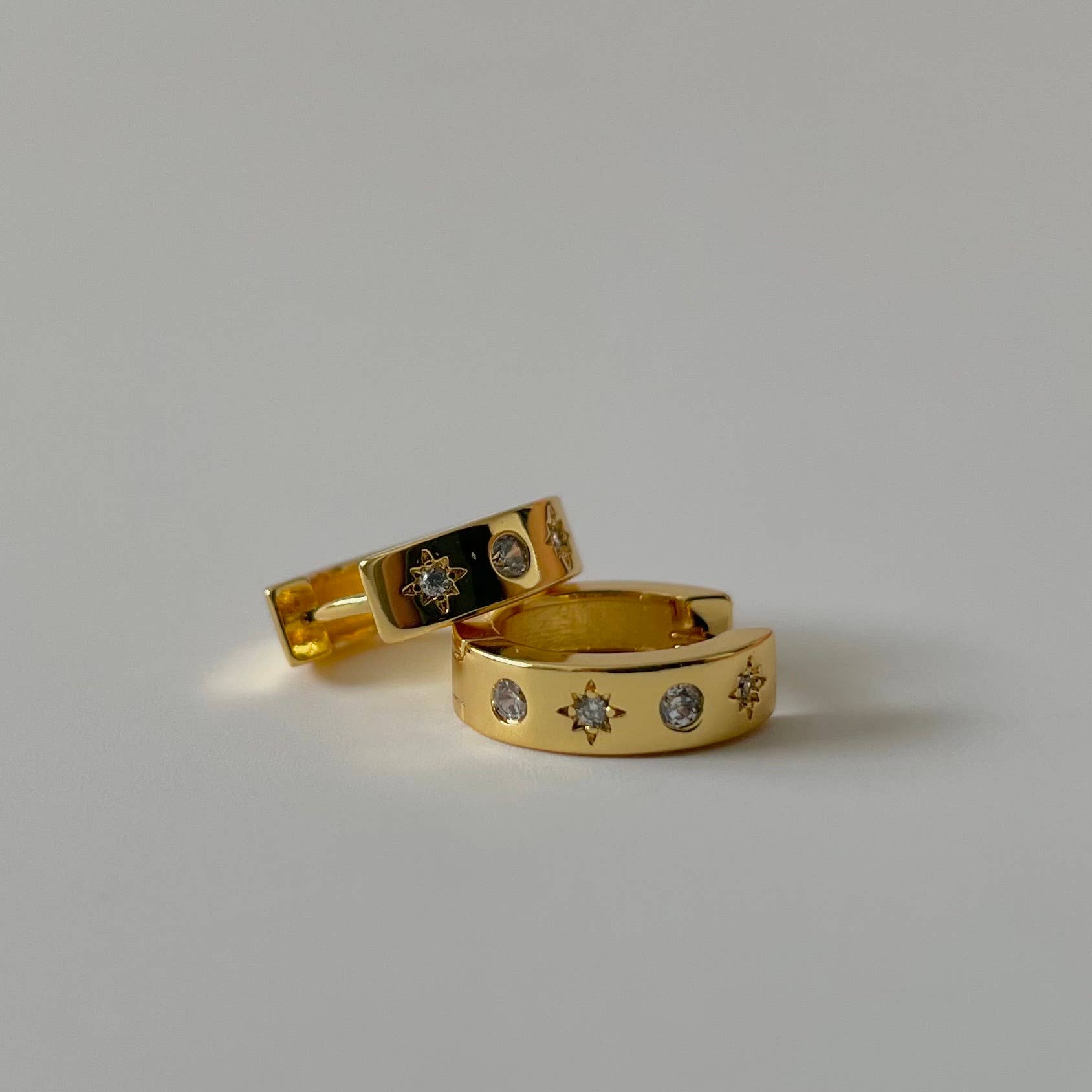 Our Star and Stone Huggie earrings feature an intricate interplay of stone and star details. Wear one, or wear them together for a unique look.